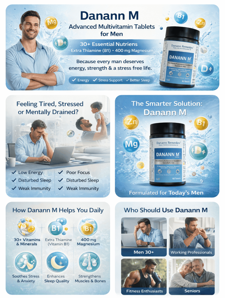 Do you feel fatigued all the time, get distracted easily, or experience constant stress and low sleep? These need not always indicate the need for powerful medications. More often, these issues arise from the body lacking important vitamins and minerals it requires on a regular basis. If left ignored, these deficiencies will decrease energy levels, weaken the immune system, and lower productivity over time. Danann Remedies presents Danann M, one of the best multivitamin tablets for men in India. It has 30+ beneficial vitamins and minerals, added Thiamine (B1) for nerve function and endurance, and high 400 mg Magnesium to combat stress, build muscle, and increase energy. As compared to everyday multivitamins that merely offer bare essentials, Danann M multi-vitamin tablets for men are formulated with the pace of today’s life and increased demands.