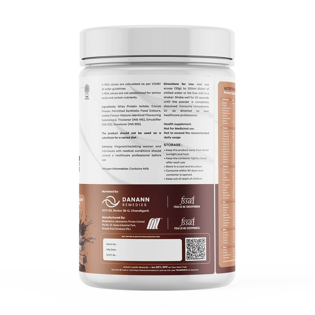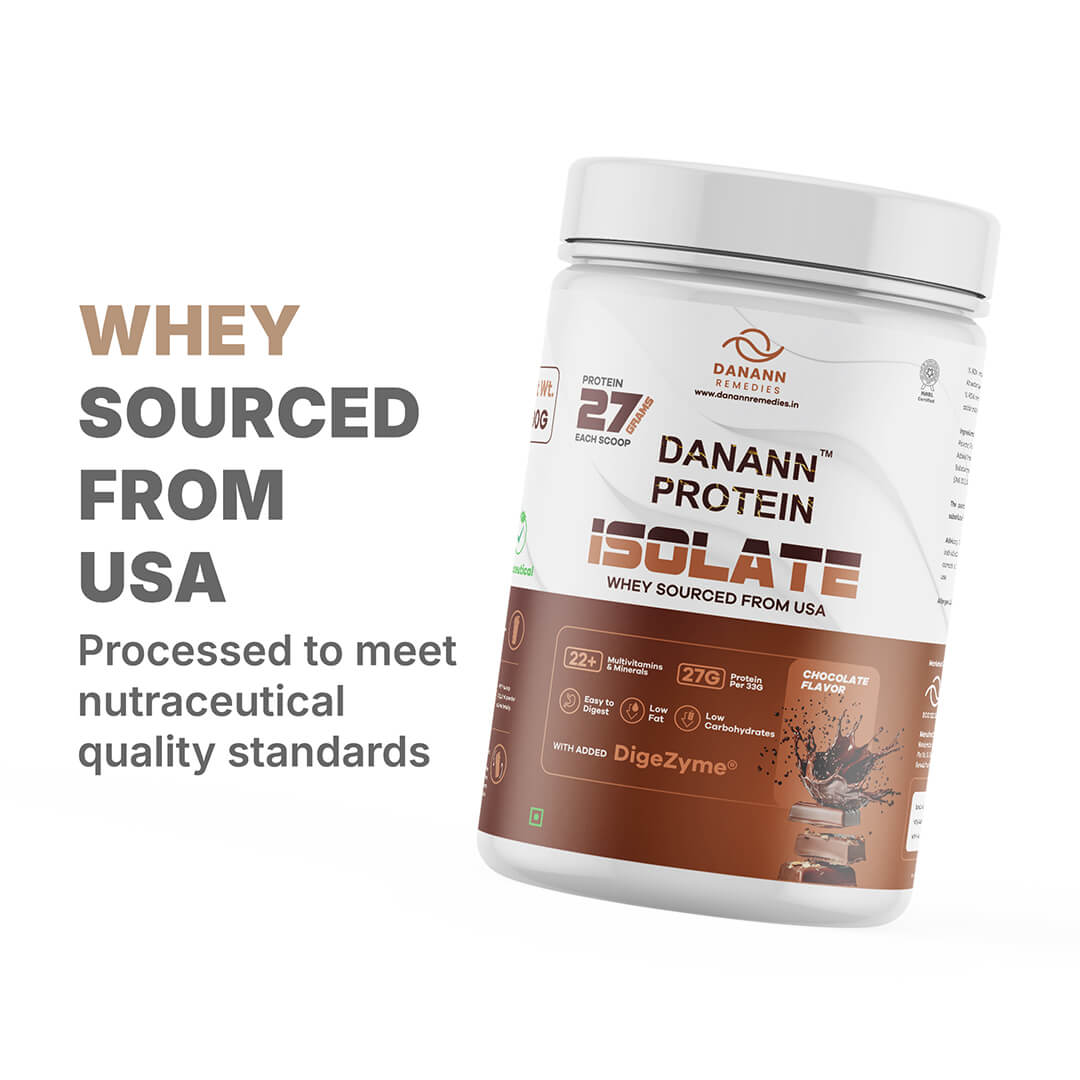 As per the Indian Council of Medical Research Danann Protein Isolate is a scientifically formulated, ultra-pure whey protein isolate designed to fuel strength, stamina, and overall vitality. Each serving delivers 22 g of premium-quality protein with minimal carbohydrates and fats, ensuring rapid absorption and complete amino acid support.